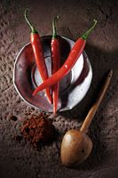 drie chilipepers op een tinnen bord met houten lepel en chilipoeder op een rustieke stenen achtergrond, studio-opname