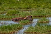 Deze waterbuffel zit lekker te chillen en te koelen in het water van het rijstveld.