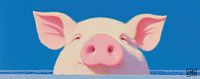 Chillin - Dit varken schilderij toont een vrolijk roze varken tegen een helderblauwe lucht, met de kenmerkende ronde, lichtglanzende snuit prominent in beeld, wat een humoristisch en opgewekt tafereel oplevert.