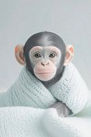 Een kleine chimpansee, lief en schattig, gewikkeld in een grof gebreid kleed. Het snuitje en de grote flaporen van het aapje zijn roze en het gebreide kleed is licht blauw. Het beeld is met behulp van ai gegenereerd.