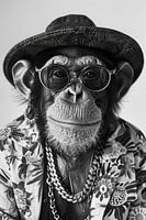 Een humoristisch zwart-wit portret van een chimpansee, stijlvol gekleed in een zomers shirt, hoed en ronde bril. Perfect voor creatieve en onderhoudende inhoud.