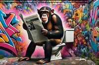 Voor een levendige muur met kleurrijke graffiti zit een chimpansee nonchalant op een toilet een krant te lezen. Dit grillige en geestige scenario lijkt een humoristisch commentaar op het alledaagse menselijke gedrag. De chimpansee lijkt ontspannen en volledig opgegaan in zijn lectuur, niet onder de indruk van de kleurrijke, creatieve explosie achter hem. De graffiti zorgt voor een karaktervolle en creatieve achtergrond, met levendige kleuren en interessante figuren die nieuwsgierigheid opwekken en de scène verlevendigen. De compositie speelt met elementen van straatkunst en dierenfotografie om een werk te creëren dat zowel tot nadenken stemt als een glimlach oproept.