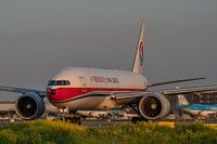 Boeing 777 van China Cargo Airlines taxiet tijdens het gouden uurtje via taxibaan Q naar één de startbanen op luchthaven Schiphol.