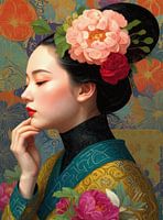 De vrouw, met een serene en peinzende uitdrukking, is gekleed in een weelderig gewaad met gedetailleerde patronen in goud en turquoise. Haar haar is opgestoken en versierd met een weelderige roze pioenroos en een dieprode roos, wat een krachtig, maar zacht accent toevoegt.