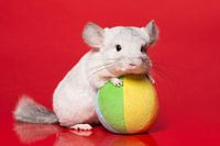 Schattige chinchilla met een kleurrijke bal tegen een rode achtergrond