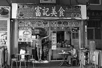 Man eet lunch op terrasje van bistro restaurantje in Mong Kok, Kowloon (Yau Ma Tei) en onttrekt zich even aan de hectiek van de wereldstad en metropool Hongkong, Hong Kong. Een menukaart (menu) aan de muur in Chinees schrift (Hanzi) met culinaire Chinese en Kantonese gerechten, dumplings, streetfood (street food).