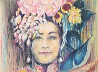 Pasteltekening in zachte kleuren van een jong Chinees meisje. Zij kijkt ons olijk aan en heeft een glimlachje op haar gezicht. Op haar hoofd heeft zij een bloemenpracht in roze en witte kleuren. Zij draagt grote hangende oorbellen met witte parels. Aan de zijkant zijn er zonnebloemen en een chrysant te zien.