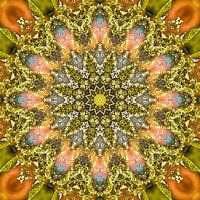 Een veelkleurig barok roosvenster, gebaseerd op een foto van de bloesems van een stachyurus chinensis in het voorjaar.