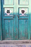 Zonlicht op oude, doorleefde paneeldeuren met Chinese karakters in Xingping, Guilin, China. De turquoise kleuren van de panelen zijn vervaagd en verweerd. Aziatische oosterse sfeer. Verval, degeneratie.