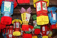 Collectie kleurrijke lantaarns, Wuzhen, China. Met de hand beschilderd en volgens de traditionele Chinese cultuur brengen de lampions geluk, voorspoed en een lang gezond leven. Colorful.