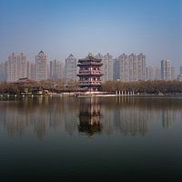 Een oude traditionele Chinese toren bevindt zich vóór één van vele flatgebouwen die rond het ontspannende en mooie Xingqinggong-Park, Xi'an, China worden gebouwd. China bouwt veel nieuwe appartementsgebouwen in verschillende steden om tegemoet te komen aan de snelle groei van haar steden door mensen die wegtrekken uit de landelijke gebieden op zoek naar werk en welvaart.