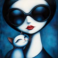 Dit charmante kunstwerk toont een stijlvolle vrouw met oversized zonnebril en een liefdevolle kat die dicht tegen haar aan nestelt. De intens blauwe tinten en de felrode lippen creëren een harmonieus contrast, terwijl de subtiele expressie van de vrouw en het tevreden glimlachje van de kat een gevoel van rust en verbondenheid…