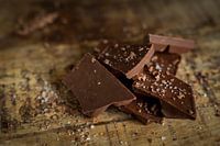 Foto van chocolade brokken met zeezout op een houten snijplank