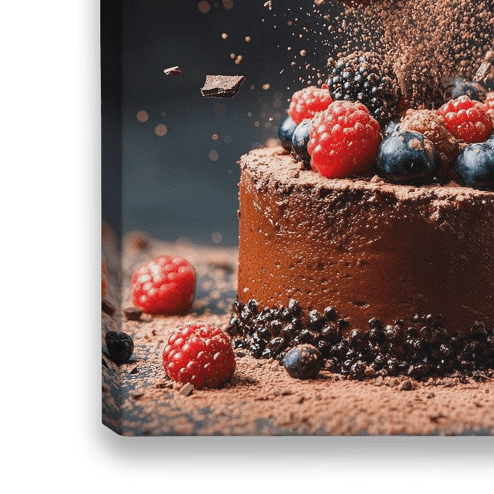 In een zoet moment van vreugde dansen stukjes chocolade door de lucht terwijl sappige bessen troont op een verleidelijke chocoladetaart. Het contrast tussen de donkere fondant en het heldere fruit roept een feest voor de zintuigen op dat ideaal is in een uitnodigende keuken om culinaire inspiratie en plezier te bevorderen.
