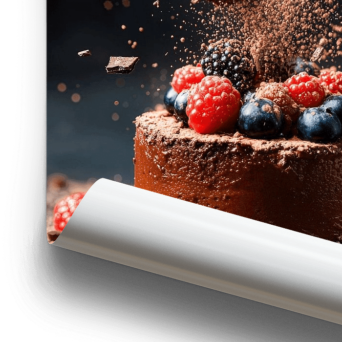 In een zoet moment van vreugde dansen stukjes chocolade door de lucht terwijl sappige bessen troont op een verleidelijke chocoladetaart. Het contrast tussen de donkere fondant en het heldere fruit roept een feest voor de zintuigen op dat ideaal is in een uitnodigende keuken om culinaire inspiratie en plezier te bevorderen.