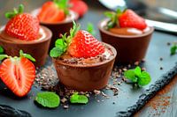Een verleidelijke verleiding van smeltende chocolade, overgoten met verse aardbeien en een vleugje munt. Deze zoete lekkernijen nodigen uit om te snoepen en stralen een vleugje elegantie uit. Perfect als decoratie in de keuken, voegen ze een luchtige, verwennende charme toe aan elke kamer. Een feest voor de zintuigen!