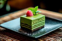 Een heerlijk meesterwerk op een elegant zwart bord: het zachte, groene oppervlak van het dessert straalt frisheid uit, terwijl de framboos en het muntblaadje een vleugje fruitigheid toevoegen. Deze aantrekkelijke traktatie is perfect voor in de keuken of eetkamer en zal in de smaak vallen bij iedereen die van zoet houdt.