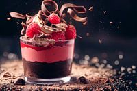 Een verleidelijk gezicht dat de zintuigen prikkelt! Deze hemelse dessertcreatie combineert fijne laagjes chocoladeverleiding, fruitige frambozen en kunstig chocoladeschaafsel. Het samenspel van kleuren en texturen maakt het de perfecte blikvanger in de keuken - elk bezoek zal een heerlijke ervaring zijn!