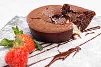 Culinaire fotografie: heerlijke chocolade soufflé met witte chocolade vulling. Mooi opgemaakt door een food stylist en gefotografeerd in de studio.