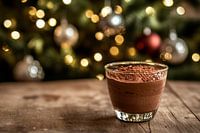 Een verleidelijke chocoladecrème in een elegant glas, omringd door zachte kerstboomlichtjes, nodigt je uit om ervan te smullen. De harmonieuze combinatie van feestelijke flair en culinaire hoogstandjes maakt dit plaatje perfect voor in de keuken of de ontbijthoek, waar het uitnodigt tot gezellige momenten.