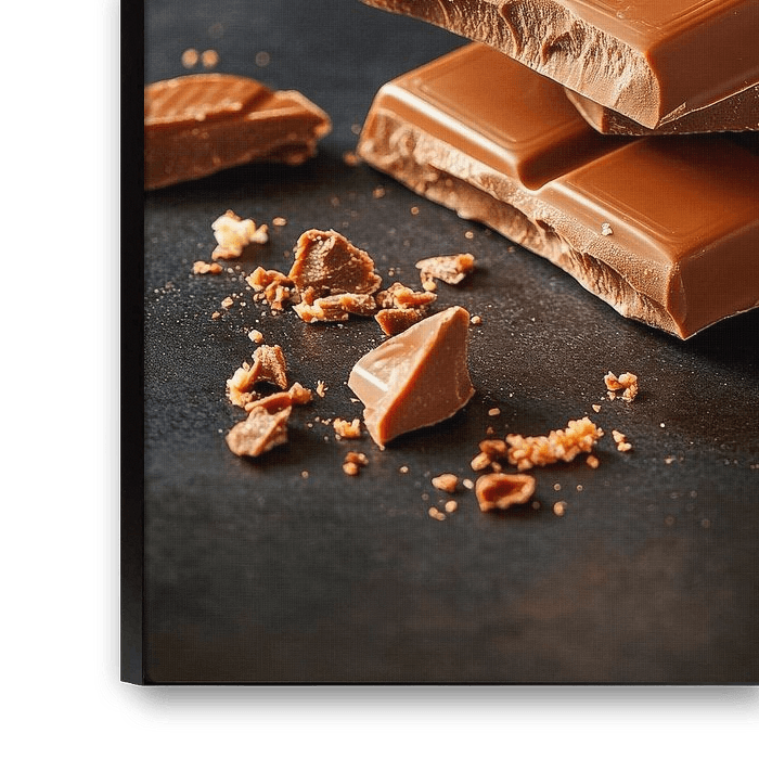 Een verleidelijk geheel van smeltzachte chocolade, perfect geënsceneerd op een donkere achtergrond. Het glanzende, karamelkleurige oppervlak en de knapperige stukjes nodigen uit tot smullen. Deze foto zou een prachtig accent vormen in een moderne keuken of een uitnodigende woonkamer en de liefde voor zoete lekkernijen benadrukken.