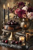 Dit romantische stilleven in diepe bordeaux-, goud- en bruintinten met chocoladetaart, kersen en bloemen voelt elegant en luxueus aan en brengt warmte in je interieur. Het zorgt voor een gevoel van verfijning en een feestelijke sfeer.