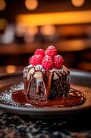 Een verleidelijk chocoladekoekje, overgoten met sappige frambozen, straalt pure heerlijkheid uit. De zoete chocoladesiroop loopt verleidelijk over het delicate oppervlak en wordt aangevuld met een lichte bestuiving van poedersuiker. Ideaal om een uitnodigende sfeer te creëren in de keuken of eethoek en gasten uit te nodigen om te…