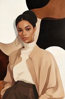 Moderne portretillustratie van een stijlvolle vrouw in een eigentijdse, minimalistische stijl. Het kunstwerk toont een elegante figuur met een klassiek opgestoken kapsel en grote ronde oorbellen. Ze draagt een beige jas over een witte coltrui, met een bruine rok, wat een verfijnde en modieuze uitstraling geeft.
