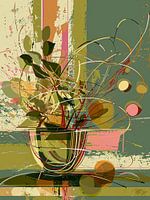 Dit werk van René van den Berg is een expressief digitaal stilleven waarin de abstractie de overhand neemt. Doorzichtige vaas wordt omhuld door een kluwen van wilde lijnen en spiraalvormen die dansen in een achtergrond van olijfgroen, zandgeel en zalmroze, doorspekt met spatten van levendige kleuren. De gestileerde bladeren lijken bijna…