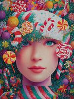 Christmas Candy Cane - Een vrolijke confrontatie tussen een zacht menselijk gezicht en een explosie van snoep. Dit kerst schilderij toont een groot, stilstaand portret waarbij het gezicht de stilte bewaart en alles rondom bruist van suiker en kleur. De ogen kijken direct naar de kijker, helder en bijna glasachtig groen, en vormen samen…
