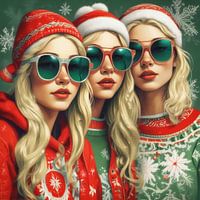 Portret van 3 jonge dames met kerstmutsen en kerstkleding. Betreft een AI impressie die bewerkt is in photoshop.