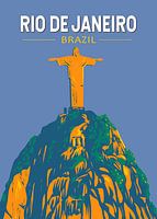Een gestileerde poster van het iconische Christus de Verlosser-beeld bovenop de Corcovadoberg, tegen een blauwe lucht, die de levendige cultuur van Rio de Janeiro symboliseert.