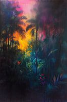 Details: neon, jungle, palmbomen, nacht, abstract, kunst, tropisch, modern, schilderij, licht