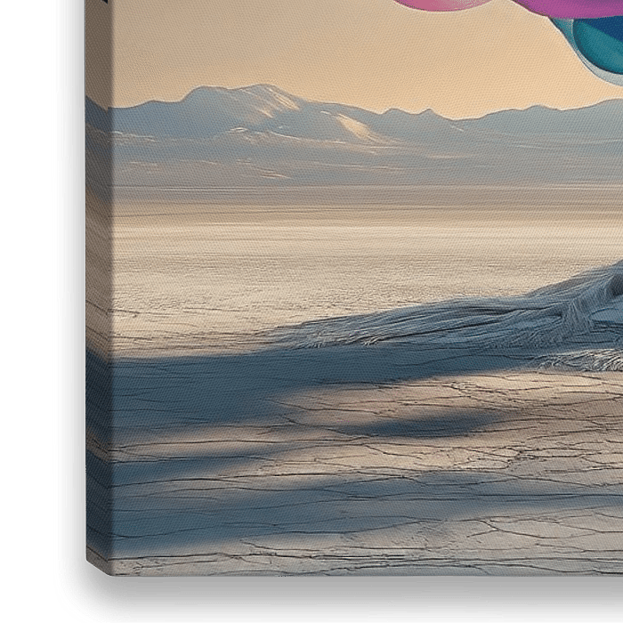 Met levendige linten die de horizon omarmen, vangt dit werk de essentie van beweging en vrijheid. De dunne, golvende lijnen van de linten lijken te dansen met de wind, terwijl hun felle kleuren contrasteren met de uitgestrekte woestijn en de zachte gloed van de opkomende zon. Het landschap straalt een gevoel van oneindige rust uit,…