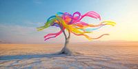 Dit kunstwerk brengt een explosie van kleur en licht naar het droge woestijnlandschap, waar kleurrijke linten de lucht vullen met een gevoel van vreugde en beweging. De sierlijk gedraaide stam van de boom vormt een stabiele basis, terwijl de linten een dynamisch contrast creëren tegen de subtiele achtergrond van zand en lucht. De…