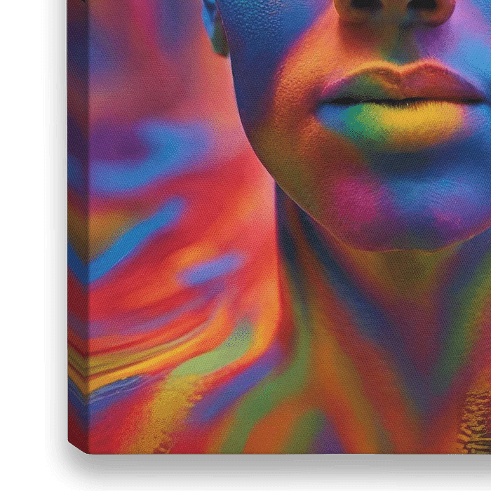 Dit kunstwerk toont een gezicht volledig bedekt met een regenboog van kleuren. Levendige tinten zijn zorgvuldig aangebracht, wat resulteert in een betoverende, bijna surrealistische uitstraling. De huidtextuur en de realistische weergave van het gezicht contrasteren prachtig met de onrealistische kleuren.