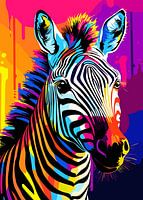 Een close-up zebraportret explodeert met regenboogkleuren, waarbij de natuurlijke strepen opnieuw worden verbeeld als levendige, druipende verfstroken.