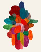 Een levendige abstracte compositie van overlappende organische vormen, gevuld met felle kleuren en fijne lineaire texturen. Het kunstwerk roept harmonie en beweging op en mengt levendige rode, blauwe, groene en gele kleuren tot een ritmische visuele ervaring. Perfect voor moderne interieurs die op zoek zijn naar energie en creativiteit