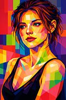 "Een verfijnd geometrisch portret dat symmetrie en levendige polygonale kleuren combineert tot een evenwichtige, moderne compositie. De heldere achtergrondpanelen versterken de diepte van het gezicht, terwijl de expressieve groene ogen een sterk focuspunt creëren. Perfect voor kunstverzamelaars en interieurkopers die op zoek zijn…