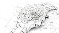 Deze gedetailleerde lijntekening toont een luxe chronograaf die voorzichtig op een vel technische tekeningen ligt. De illustratie benadrukt de fijne details van het horlogeontwerp, van de nauwkeurige tandwielen tot de elegante wijzers en wijzerplaten. De technische schetsen op de achtergrond benadrukken de complexiteit en het vakmanschap waarmee het horloge is gemaakt. Deze combinatie van design en technische precisie weerspiegelt de schoonheid en verfijning van horlogemaken, waardoor de illustratie ideaal is voor thema's die vakmanschap, techniek en luxe benadrukken.