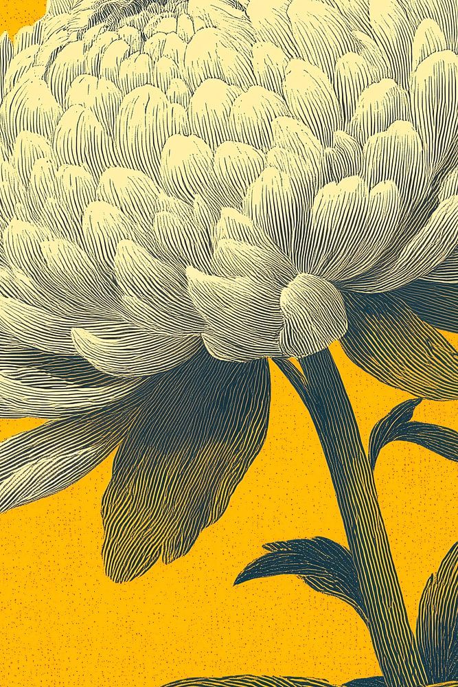 Een chrysant tegen een okergele achtergrond. De bloem straalt kracht en kalmte uit, alsof ze groeit in stilte en zonlicht tegelijk.