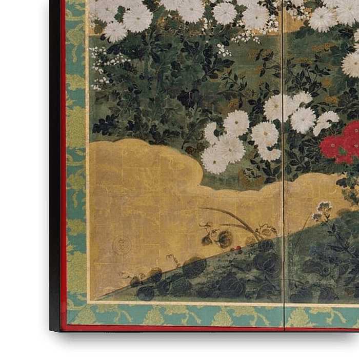 Op dit scherm zijn chrysanten (kiku in het Japans) en herfstplanten (akikusa, letterlijk "herfstgrassen") afgebeeld tegen een gouden achtergrond verlevendigd met gouden wolken. De chrysanten zijn afgebeeld in drie verschillende kleuren: wit, oranje en rood. De bloemblaadjes van de witte chrysanten zijn geschilderd in een verhoogde techniek die moriage wordt genoemd. De witbloeiende variant van de struikklaver (shirohagi; Lespedeza japonica) in de rechter benedenhoek, een favoriet motief onder Japanse dichters sinds de oudheid, wordt geassocieerd met melancholie en onbeantwoorde liefde. Blauwe Chinese klokjesbloemen (kikyō; Platycodon grandiflorus) animeren ook de rechterbenedenhoek, terwijl vanachter de chrysanten aan de achterkant groepjes delicaat Japans zilvergras (susuki; Miscanthus sinensis) tevoorschijn komen.