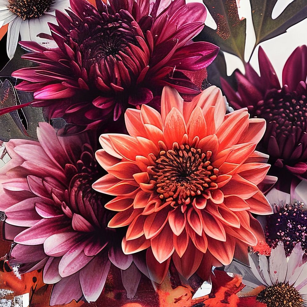 Chrysanthemum Splendour" is een kunstwerk dat de levendige en diverse schoonheid van chrysanten vastlegt. Met levendige kleuren variërend van zachtgeel tot diep bordeauxrood geeft dit schilderij een frisse en dynamische uitstraling aan elke kamer. Perfect voor woon- en werkruimtes die een vleugje frisheid en energie kunnen gebruiken. Deze muurschildering is ideaal voor mensen die hun omgeving willen verfraaien met levendige kleuren en bloemmotieven en creëert een stimulerende sfeer die uitnodigt tot creativiteit en welzijn.
