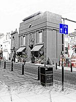 Een zwart-wit met selectieve kleurenfoto van de onderkant van Church Street in Brighton in East Sussex, UK. We zien het trottoir met paaltjes, een zwarte afvalbak en een richtingaanwijzer voor fietsers. Aan de andere kant van de weg lopen de paaltjes door en staan enkele historische gebouwen met restaurants en winkels.