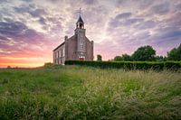 Een prachtige kerk aan de rand van een klein dorpje in de Betuwe. De lucht brokkelde mooi open en de zon maakte daar graag gebruik van. Achter de kerk ontstond een oranje kleurenexplosie wat in dit geval een mooi decor vormde voor deze markante kerk.