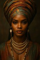 Met een intense blik en warme aardetinten straalt deze vrouw kracht, waardigheid en mysterie uit. Het licht accentueert subtiel haar gelaatstrekken, sieraden en traditionele hoofddoek, waardoor dit kunstwerk een moderne ode aan Afrikaanse schoonheid vormt.