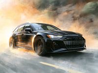 Een glanzende, pure nachtschaduw omhult de Audi RS6, haar lijnen scherp als potloodstreken op ruw papier. De imposante grille schittert in zilveren schaduwen, terwijl de brede achterspoiler in dynamische, vegen van grijs en zwart uitpuilt. Verlichte koplampen knipperen als neon‑accenten, en de sportieve velgen draaien zich in een wervelend, schetsachtig patroon. Deze duistere kracht ademt snelheid, elegantie en rauwe kunst.