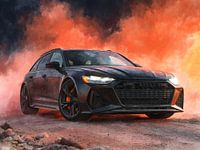 Een glanzende, pure nachtschaduw omhult de Audi RS6, haar lijnen scherp als potloodstreken op ruw papier. De imposante grille schittert in zilveren schaduwen, terwijl de brede achterspoiler in dynamische, vegen van grijs en zwart uitpuilt. Verlichte koplampen knipperen als neon‑accenten, en de sportieve velgen draaien zich in een wervelend, schetsachtig patroon. Deze duistere kracht ademt snelheid, elegantie en rauwe kunst.