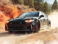 Een glanzende, pure nachtschaduw omhult de Audi RS6, haar lijnen scherp als potloodstreken op ruw papier. De imposante grille schittert in zilveren schaduwen, terwijl de brede achterspoiler in dynamische, vegen van grijs en zwart uitpuilt. Verlichte koplampen knipperen als neon‑accenten, en de sportieve velgen draaien zich in een wervelend, schetsachtig patroon. Deze duistere kracht ademt snelheid, elegantie en rauwe kunst.