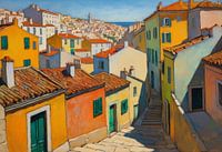 Dit op oliepastel geïnspireerde schilderij verbeeldt de iconische stadsgezichten van Cinque Terre, waar gestapelde huizen zich vastklampen aan dramatische kliffen die zich in de richting van de zee storten. Schilderachtige streken vloeien als golven en verzachten de architectuur en het landschap tot heldere textuurlagen. Het…